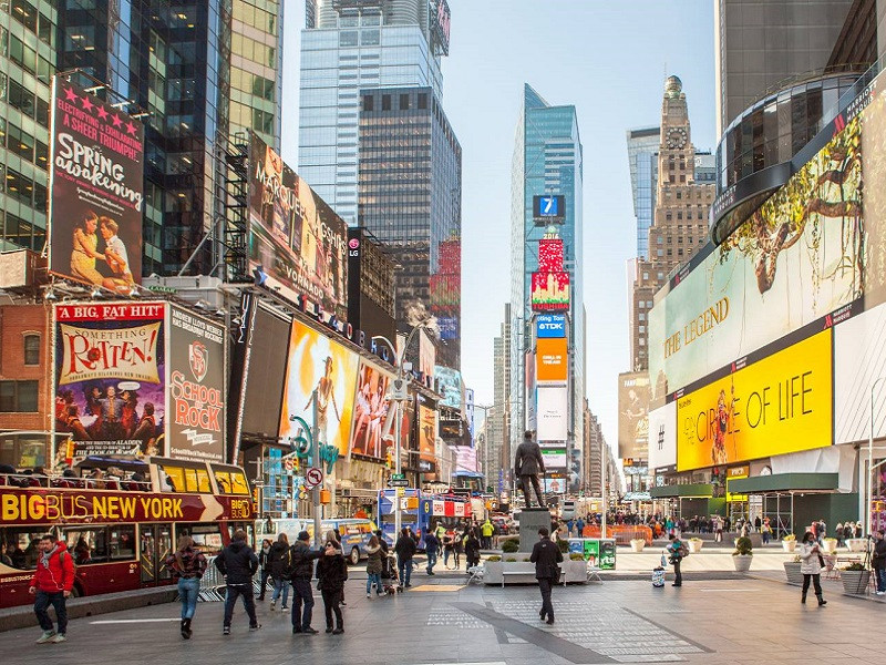 - Timesquare - Quảng trường trung tâm thành phố New York nổi tiếng với những ánh đèn màu và bảng quảng cáo. Là một giao lộ chính ở Manhattan, Time Square nằm giữa Đại lộ Số sáu và Đại lộ Số chín, kéo dài từ đông sang tây; giữa Đường thứ 39 Tây và Đường thứ 52 Tây; Time Square New York là lựa chọn hàng đầu của nhiều du khách muốn đến trong vô vàn những điểm tham quan Mỹ khá phong phú. Time Square được xem như là một biểu tượng của thành phố New York.