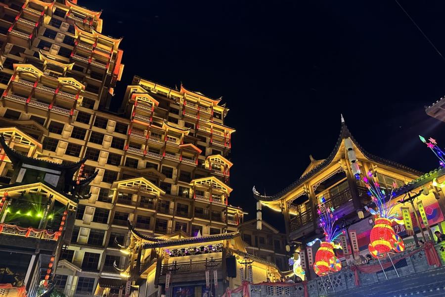 - Sau đó, tự do dạo quanh chiêm ngưỡng cảnh đêm Nữ Nhi Thành - tựa như "Tây Lương Nữ Quốc" bước ra từ truyền thuyết. Nơi đây cuốn hút du khách bởi kiến trúc mang đậm dấu ấn dân tộc Thổ Gia cùng với vô vàn hoạt động văn hóa và giải trí đặc sắc. Từ những điệu múa, bài hát truyền thống đến các màn biểu diễn đường phố và món ăn địa phương hấp dẫn, tất cả đã tạo nên một sức hút khó cưỡng cho Nữ Nhi Thành.