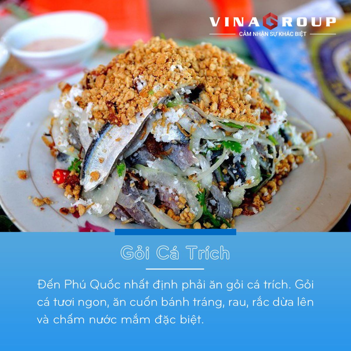 Đến Phú Quốc nhất định phải ăn gỏi cá trích. Sẽ chẳng thể nào tìm được món gỏi ngon như thế này ở Sài Gòn, nhắc đến đã thấy thòm thèm. Gỏi cá tươi ngon, ăn cuốn bánh tráng, rau, rắc dừa lên và chấm nước mắm đặc biệt.