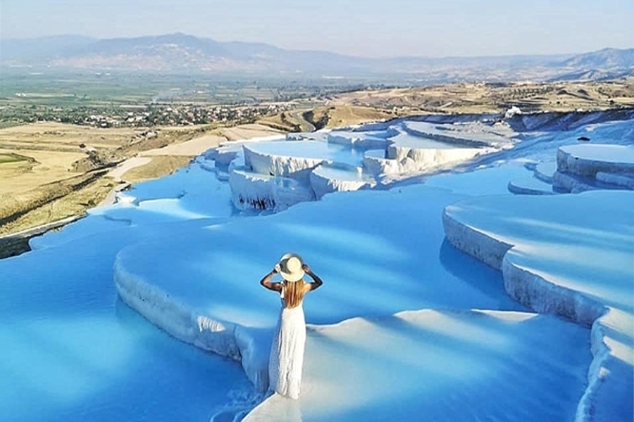 • Tiếp tục di chuyển đến Pamukkale. Đây là một điểm đến hấp dẫn nhất nhì Thổ Nhĩ Kỳ bởi vẻ đẹp của những dãy núi xanh rì bao quanh cùng với các thung lũng rộng lớn. Những hồ nước xanh rì xếp thành nhiều bậc đã tạo nên 1 vẻ đẹp độc đáo. Nước trong “hồ bông” này là nước khoáng tinh khiết còn có tác dụng chữa bệnh. Pamukkale có đến 17 suối nước nóng với nhiệt độ từ 35 – 100 độ nên từ lâu người ta đã biết tận dụng để mở các dịch vụ spa, nghỉ dưỡng để phục vụ du khách.