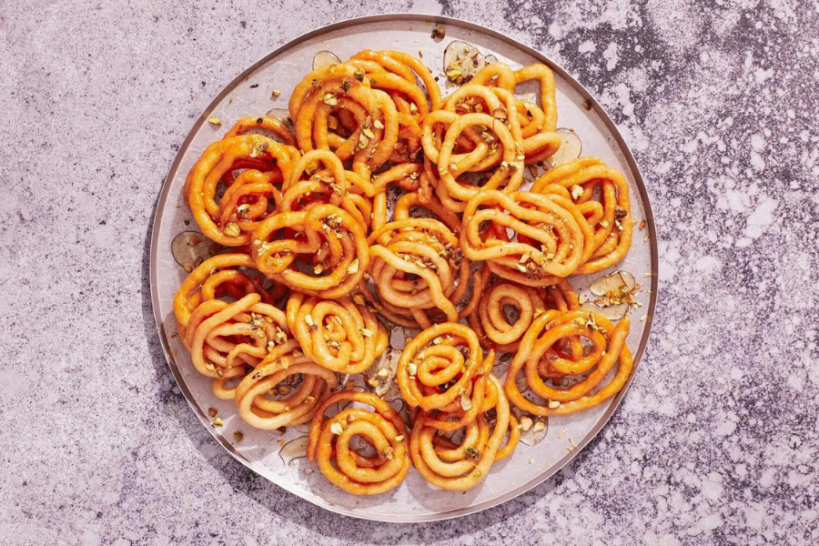 Loại bánh ngọt màu cam đẹp mắt Jalebi được làm từ một loại bột lên men sau đó rán vàng bằng bơ và rưới siro đường. Bánh jalebi có hình thù như những sợi mì dính tròn vào nhau.