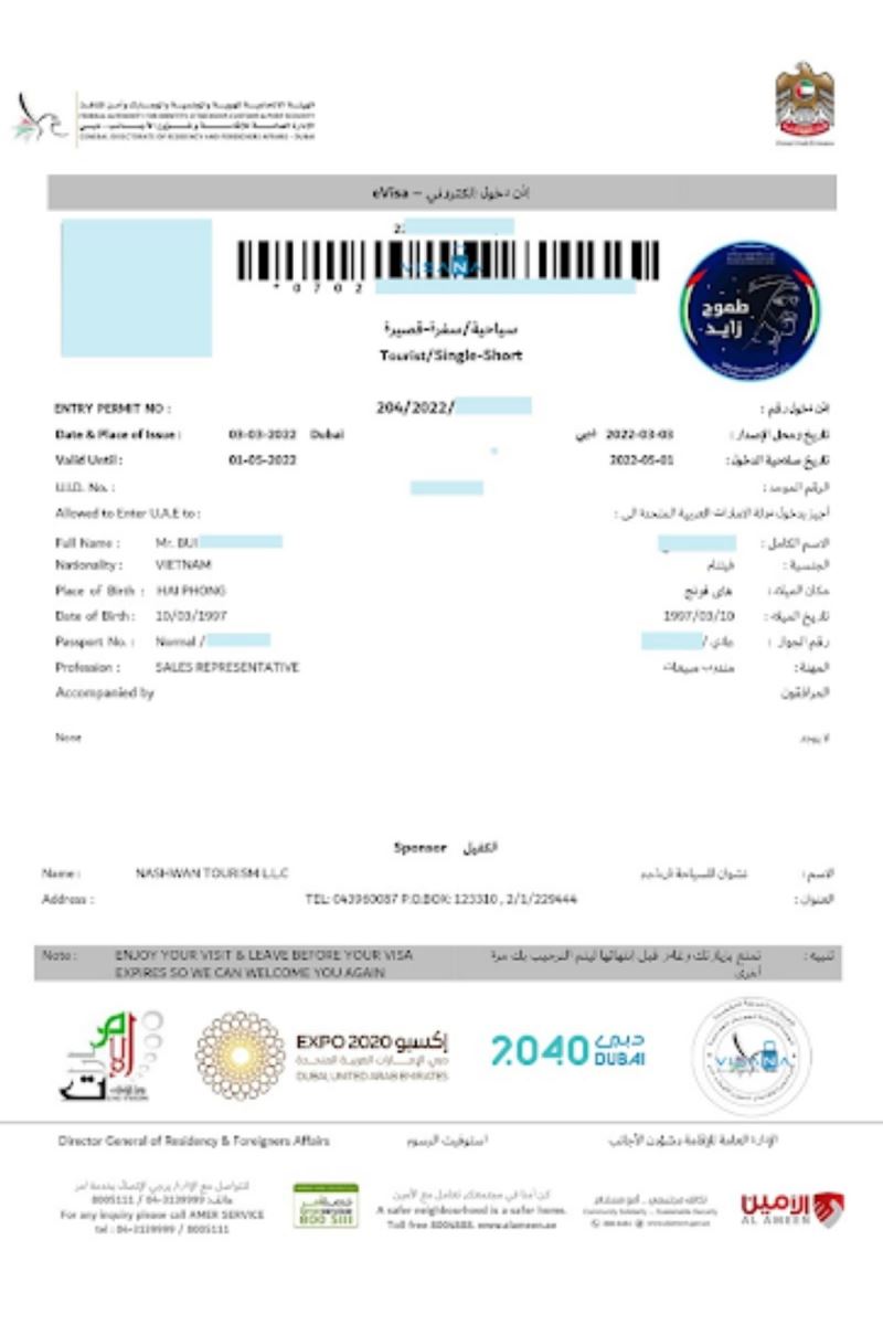 Visa du lịch: Chỉ được nhập cảnh một lần, thời gian lưu trú tối đa tại Dubai là 30 ngày. Người xin visa cần được bạn bè hoặc người thân sống ở Dubai bảo lãnh.