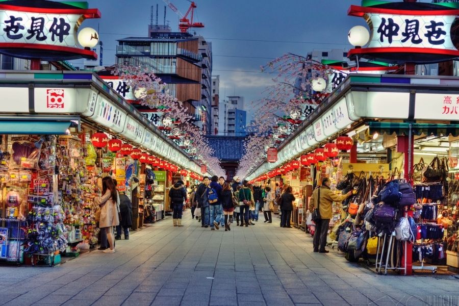 Đây là con đường dẫn đến đền Sensoji ở Asakusa với nhiều cửa hàng nhỏ bên đường bán thực phẩm và những đồ lưu niệm nhỏ đáng yêu. Bạn có thể vừa tham quan vừa tản bộ và mua bánh kẹo, quà tặng truyền thống như dép và kimono, phụ kiện túi, mũ,...
