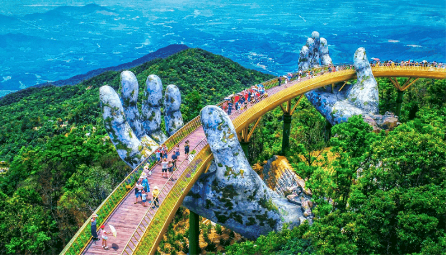 Quý khách thả mình vào không gian tuyệt đẹp như nước Pháp và khí hậu tuyệt vời được ví như Đà Lạt của miền Trung, tham quan vườn hoa, hầm rượu, chùa Linh Ứng, Thích Ca Phật Đài, đặc biệt là chiêm ngưỡng và chụp ảnh Cầu Vàng, cây cầu có kiến trúc độc nhất vô nhị với đôi bàn tay khổng lồ nâng đỡ Cầu Vàng tuyệt đẹp. Quý khách xuống cáp về lại trung tâm và được thoải mái tắm biển Mỹ Khê, là một trong rất ít bãi biển đẹp nhất hành tinh.