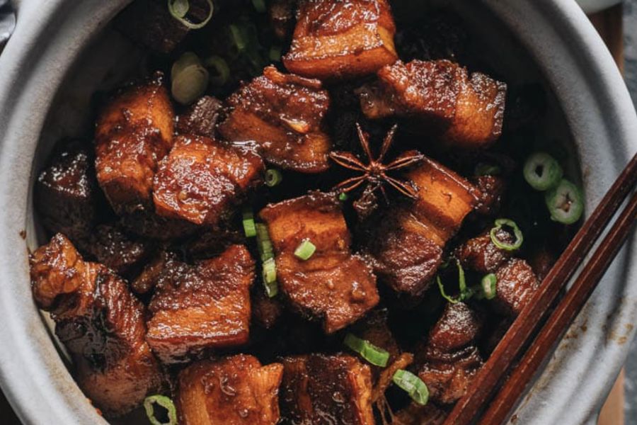 Món thịt heo kho tộ với nước sốt đậm đà, được nấu từ thịt heo, nước dừa, trứng cút, tỏi, ớt và các loại gia vị khác. Moo Hong thường được ăn kèm với cơm trắng và salad rau sống.
