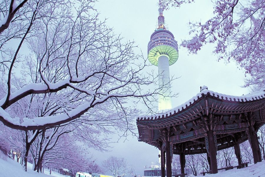 Tháp Namsan hay còn gọi là tháp tình yêu - ngọn tháp nổi tiếng nhất Hàn Quốc là địa điểm ngắm tuyết bạn không thể bỏ qua.