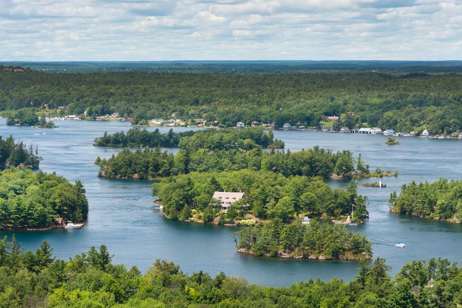Xứ Ngàn Đảo (Thousand Islands) - Điểm du lịch nổi tiếng hơn 150 năm qua, với 1,864 hòn đảo lớn nhỏ trải dài trên sông Saint Lawrence hình thành đường biên giới tự nhiên giữa Mỹ và Canada. Quần đảo Thousand Islands Canada là một trong những danh lam thắng cảnh đẹp tại Bắc Mỹ. Quần đảo này có một danh tiếng huyền bí, nơi có lâu đài, ngọn hải đăng và 1.864 hòn đảo đá granit bị bỏ lại như những mảnh vụn phía sau sông băng đang rút lui của Kỷ băng hà.