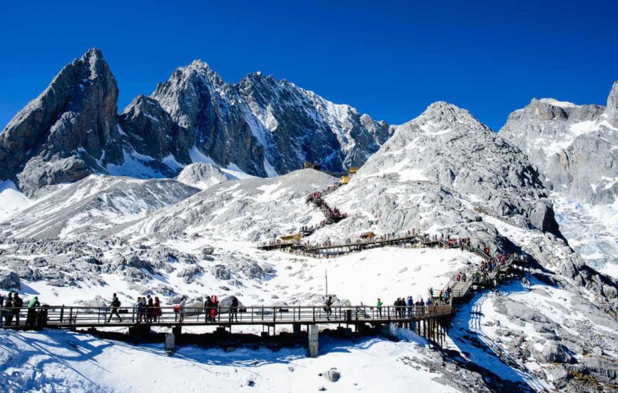 - Núi tuyết Ngọc Long: nằm ở phía Bắc phố cổ Lệ Giang, nổi bật với những đỉnh núi quanh năm phủ tuyết trắng, tạo thành một khung cảnh hùng vĩ như một con rồng bạc khổng lồ vắt ngang bầu trời, vì thế mà có tên gọi “Ngọc Long”. Vẻ đẹp tráng lệ của nơi đây khiến nhiều người ví von như “Thụy Sĩ của phương Đông”, sánh ngang với dãy Pyrenees nổi tiếng giữa biên giới Pháp và Thụy Sĩ. Du khách sẽ trải nghiệm cáp treo lớn công viên Băng Xuyên đưa lên độ cao 4.600m, tận hưởng khung cảnh ngoạn mục và lưu lại những khoảnh khắc đáng nhớ giữa thiên nhiên kỳ vĩ.