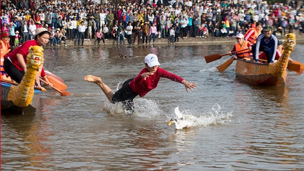 Đúng 15 giờ, tiếng còi giục cuộc thi “bắt vịt trên sông” chính thức vang lên. Những chú vịt được Ban tổ chức thả xuống dưới nước, vừa chạy bập bõm vừa nhào lộn xuống nước. Ngay lập tức, các vận động viên thể hiện tài nghệ ngụp lặn của mình. Chứng kiến những màn bơi, ngụp lặn không khác gì những con rái cá khiến khán giả đứng trên bờ sông tỏ vẻ vô cùng thích thú. Sau 10 phút tranh tài, các vận động viên nhanh tay đã thu được thành quả là các chú vịt mang lên bờ.