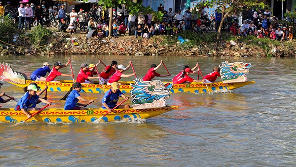 Sôi nổi nhất phải kể đến là cuộc đua thuyền rồng tập thể với đường đua dài 2000 m. Các ghe, thuyền tham gia đua được thiết kế công phu với đầu rồng, trang trí nhiều hoa văn lộng lẫy, đầy màu sắc được chuẩn bị hàng tháng và do tập thể cả xã đầu tư và đó cũng chính là là đại địa phương. Khi cờ lệnh được phất lên, 4 thuyền rồng của 4 xã đồng loạt xuất phát cũng là lúc tiếng cổ vũ, tiếng hò reo, chiêng trống thúc giục làm sôi động cả một vùng sông nước.